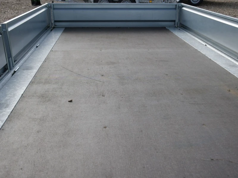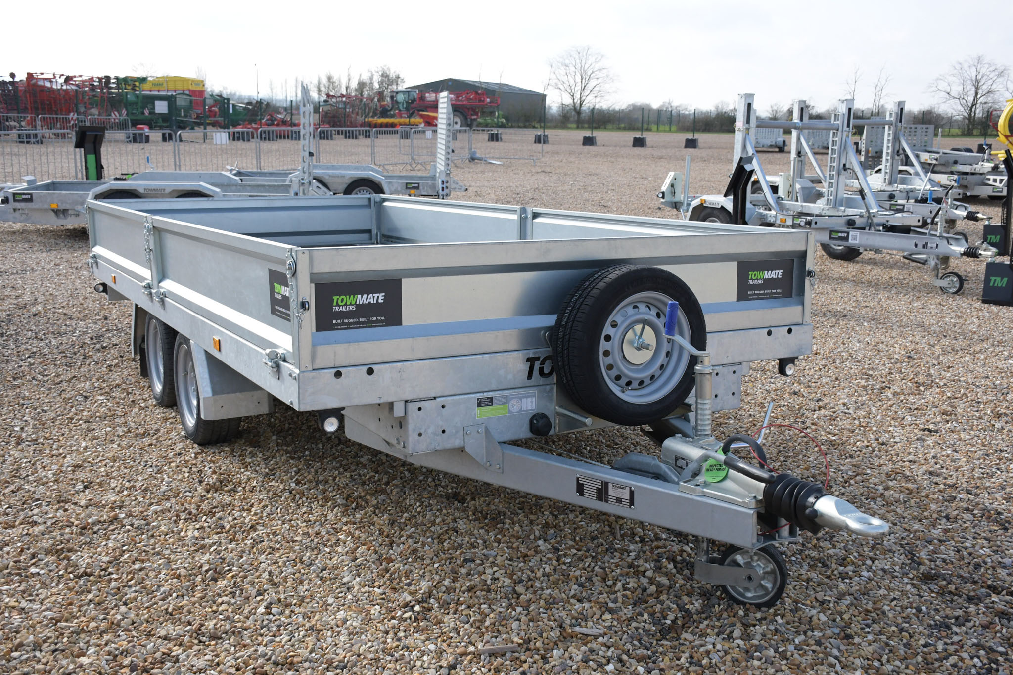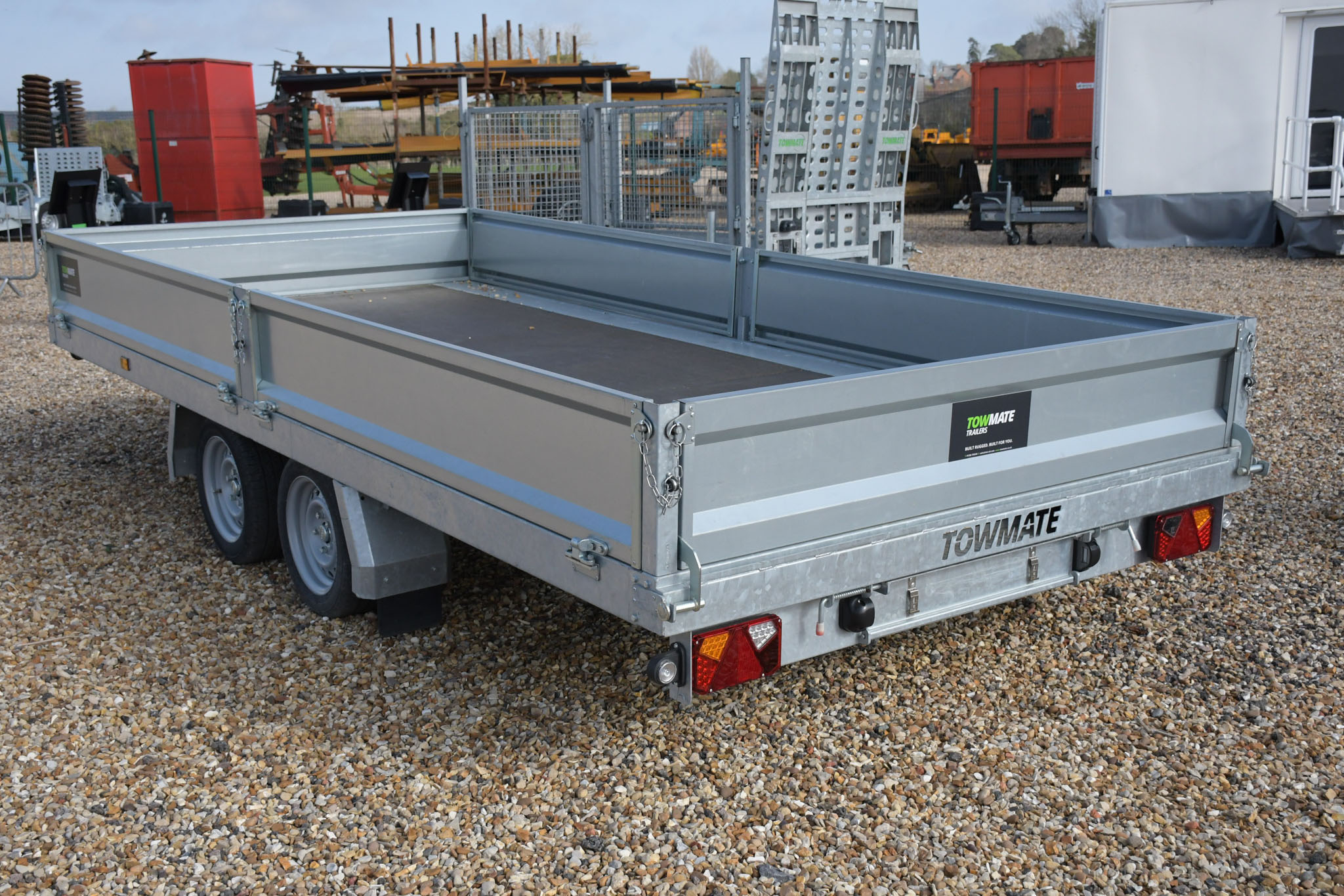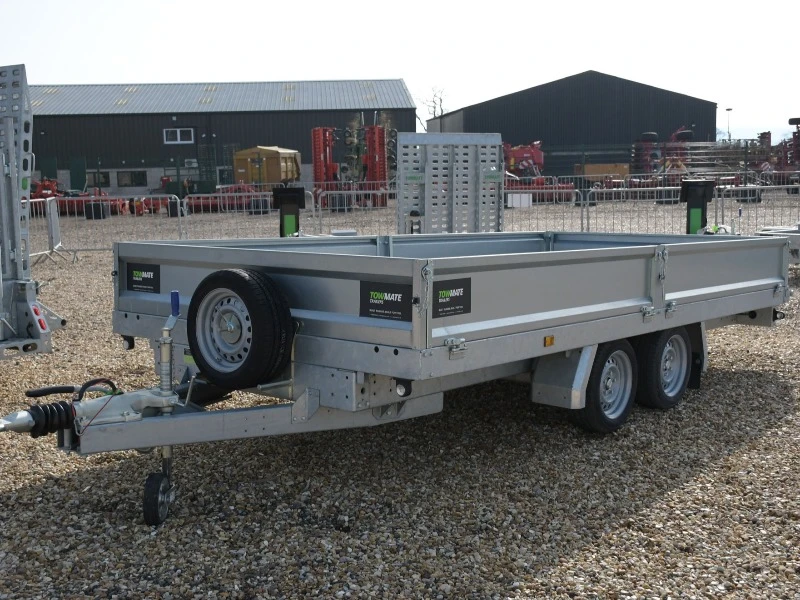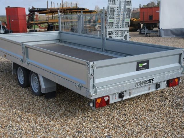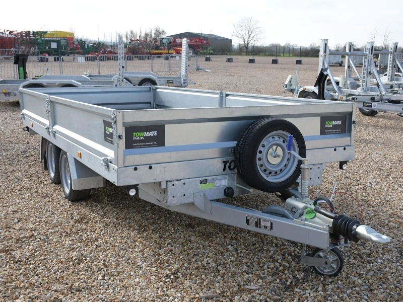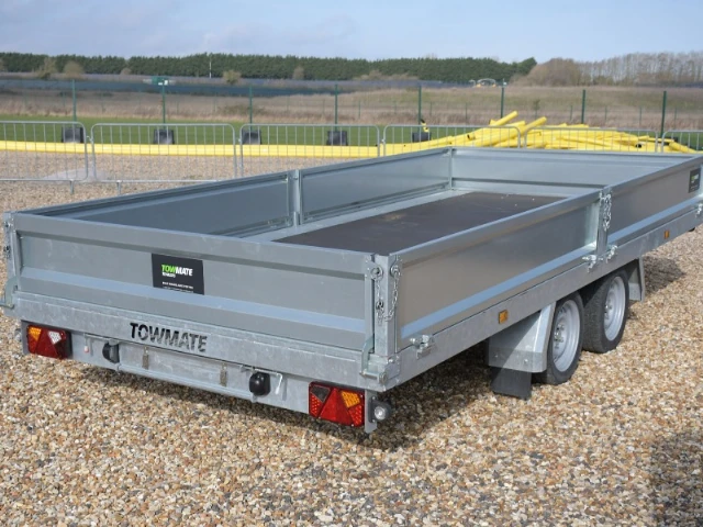 Brand new, in stock, Towmate TXFT4820-35 PRO 3500KG 4.8m/14ft flatbed trailer. Complete with drop-sides, aluminium ramps, underfloor storage and kick down props.